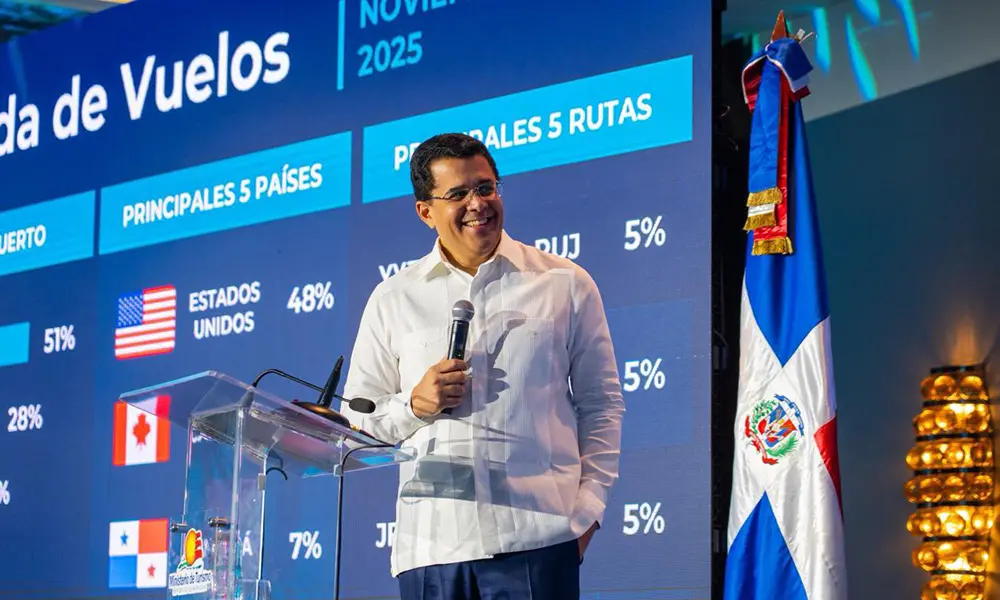 Al ofrecer el balance del comportamiento del sector en el periodo enero-noviembre, durante un acto realizado en un hotel de la capital, Collado explicó que el flujo total de visitantes creció 52% frente al 2019, 13% respecto al 2023 y 3.1% en comparación con el año pasado. Subrayó que estos resultados consolidan la posición del país como destino líder en la región. El ministro detalló que entre enero y noviembre arribaron 7,884,421 turistas por vía aérea, un incremento de 35% respecto al 2019, 10% frente al 2023 y 3% en comparación con el 2024. A esto se sumaron 2,399,830 cruceristas, cifra que representa un aumento de 153% en relación con el 2019, 25% respecto al 2023 y 3.4% frente al año anterior.